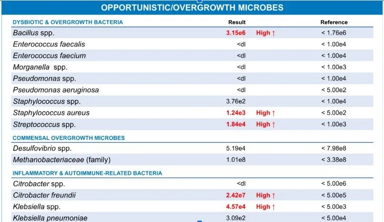 Here are some of my GI Map results from that time. First of all, I had overgrowth of opportunistic bacteria: