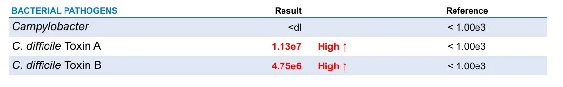GI Map Results - C. difficile infection and severe dysbiosis (overgrowth of bad bacteria) driving inflammation.